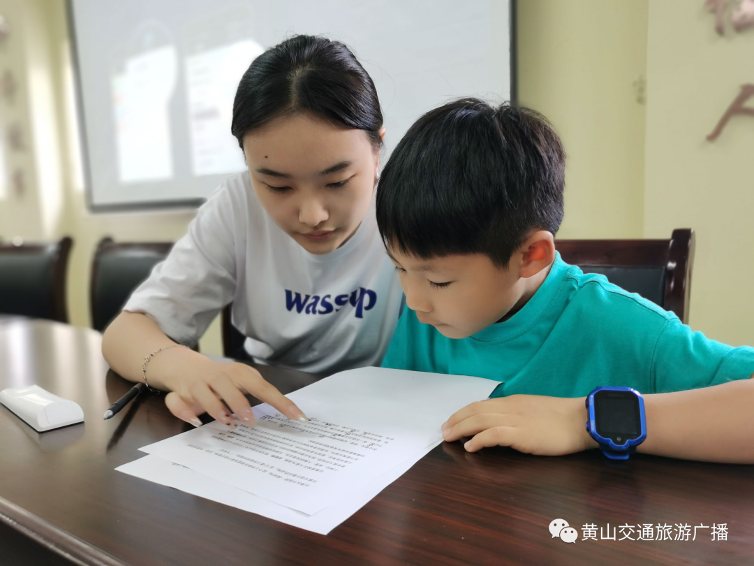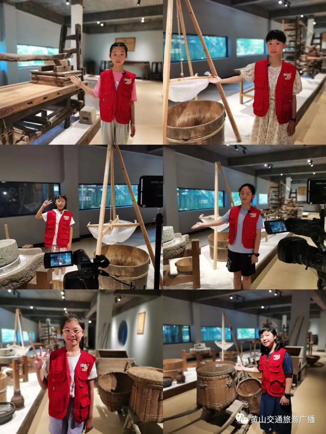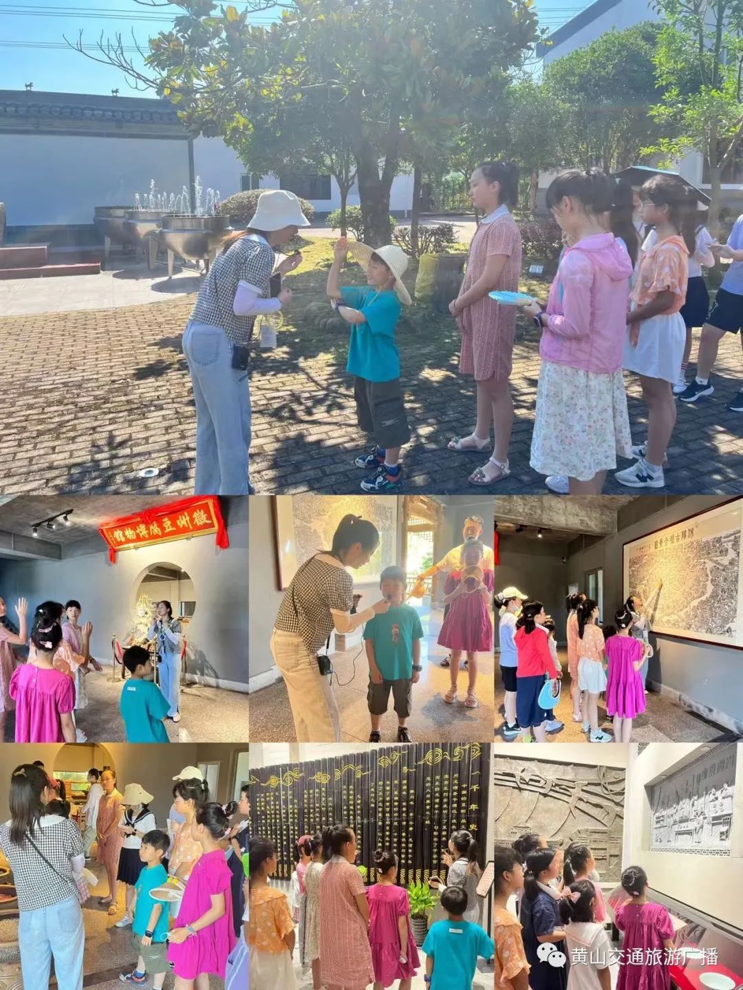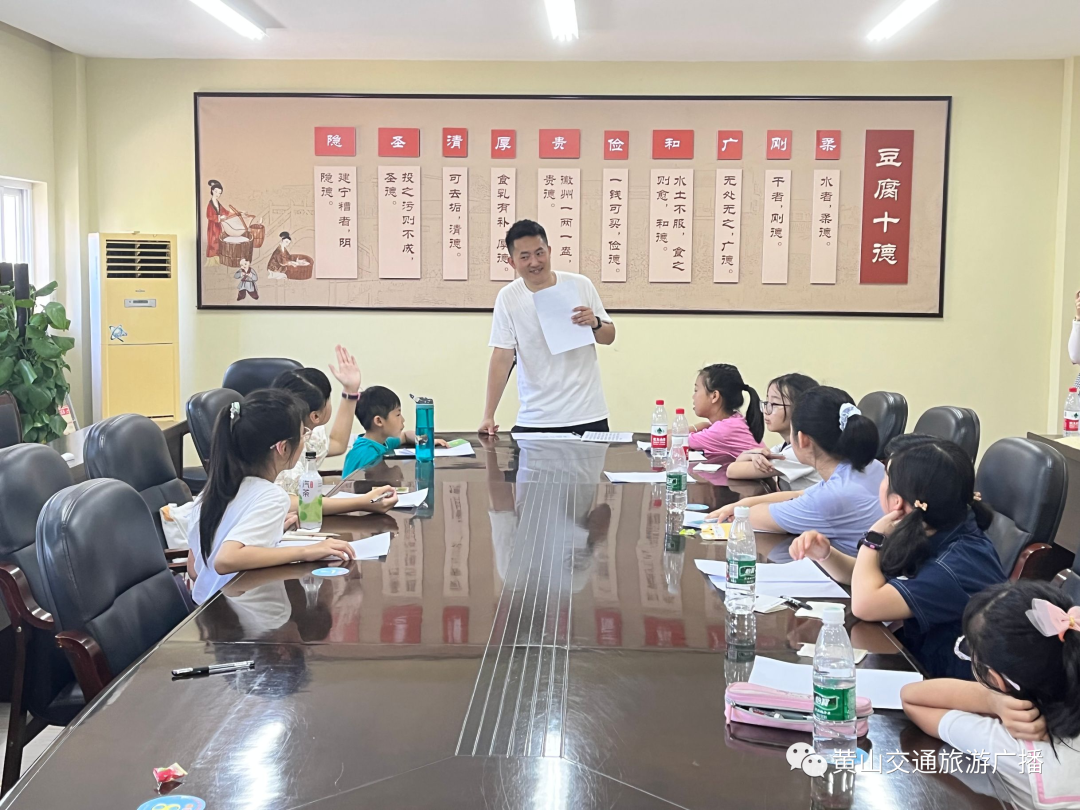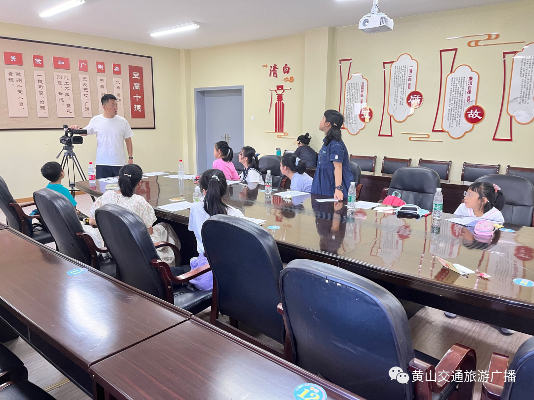 参观完博物馆,小小讲解员们也该上岗了。在黄山交广主播的带领之下,小记者和小主播们开始学习有关豆腐博物馆的讲解词。